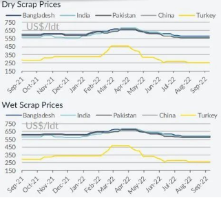 孟加拉國和巴基斯坦在冬季的幾個月里表現(xiàn)低迷。在孟加拉國,當(dāng)?shù)劁摬氖袌鱿碌s500塔卡,加劇了市場負(fù)面情緒。此外,報告顯示,信用證問題估計將在2023年1月底國際貨幣基金組織貸款獲得批準(zhǔn)時才會有所改善。目前尚未批準(zhǔn)對4000~5000 噸以上的船舶進(jìn)行融資。而在巴基斯坦,由于美元短缺,鋼鐵生產(chǎn)等行業(yè)也面臨開立信用證的問題。