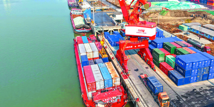 在巢湖港口碼頭一派繁忙景象,大型門機(jī)正在吊裝集裝箱至貨輪上。這批裝載各種機(jī)械與新能源設(shè)備的標(biāo)準(zhǔn)集裝箱的外貿(mào)貨物,將從巢湖港駛向上海港,經(jīng)過50個小時后抵達(dá),然后在上海洋山港直接換裝海船出口。巢湖港到上海港直達(dá)航線正式開通,打通了巢湖及周邊企業(yè)貨物直達(dá)集裝箱班輪的通道,提供了一條“高效、快捷”的國際物流大通道,免去了之前需要在沿江港口中轉(zhuǎn)的流程,節(jié)省了大量運輸時間,有效降低了企業(yè)海運物流成本。