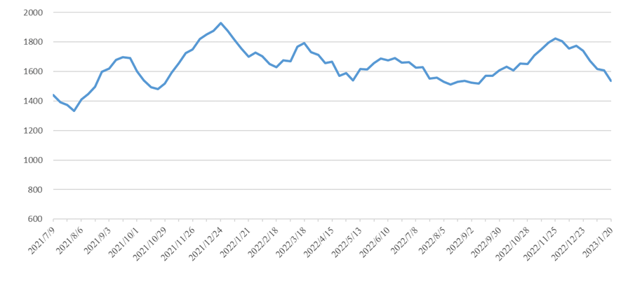 東北區(qū)域:春節(jié)前最后一周基本已提前放假貨源已基本停發(fā),市場(chǎng)運(yùn)量持續(xù)下降。本期東北指數(shù)報(bào)收1448點(diǎn),環(huán)比下跌144點(diǎn),跌幅9.05%,其中東北至華南指數(shù)報(bào)收1329點(diǎn),環(huán)比持平。