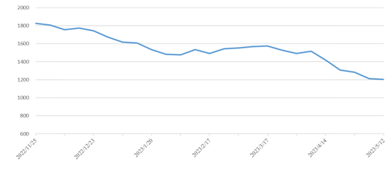 市場(chǎng)持續(xù)下行(2023年5月06日至5月12日)中國(guó)內(nèi)貿(mào)集裝箱運(yùn)價(jià)指數(shù)環(huán)比同比持續(xù)下跌。